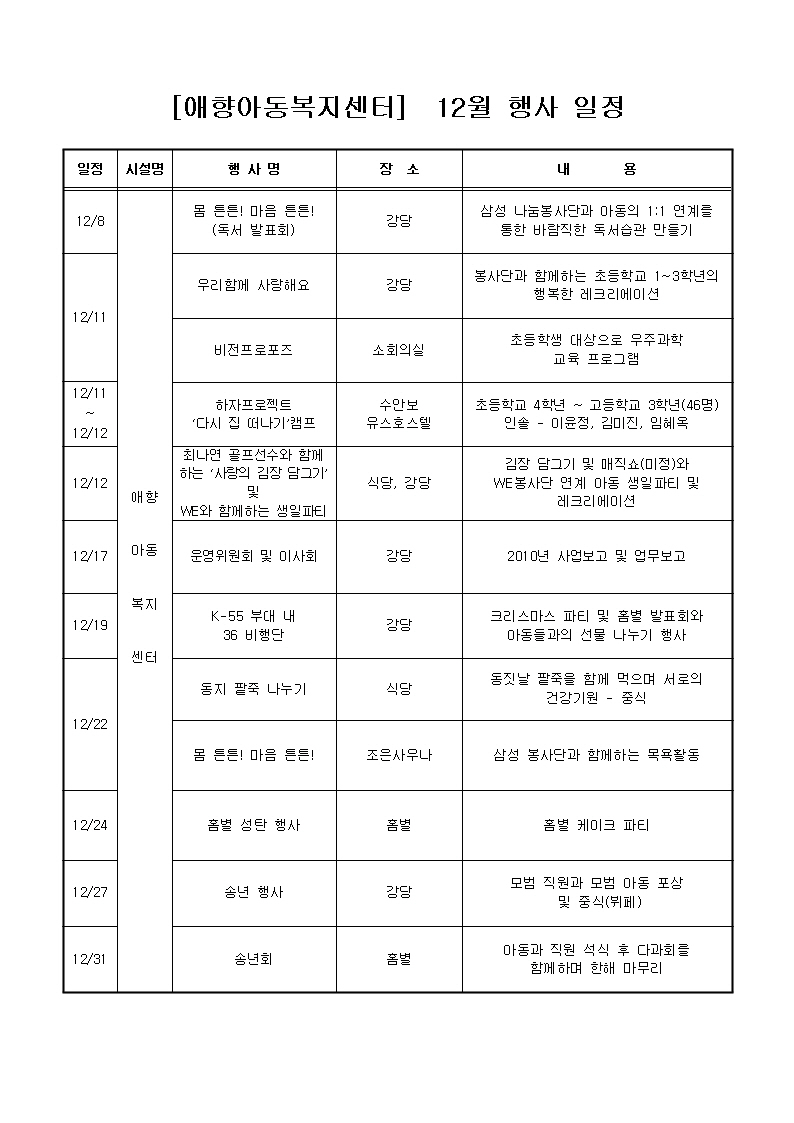 애향아동복지센터 12월 행사 일정입니다.^^