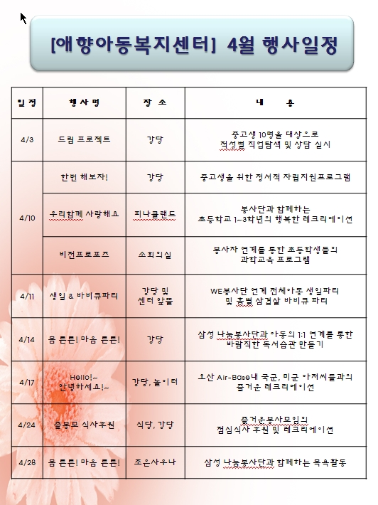 노란 개나리가 가득한 애향의 4월 행사일정을 알려드립니다.